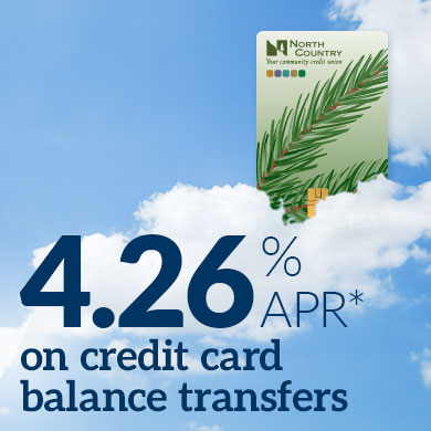 Annual percentage rate (APR) of 4.26% applies to balances transferred to a NorthCountry credit card from an external source. On 3/31/2027, the promotional APR will end and the regular APR will apply. As of 1/15/2026, regular APRs ranged from 7.45% to 16.95% based on credit qualifications, and are subject to change.